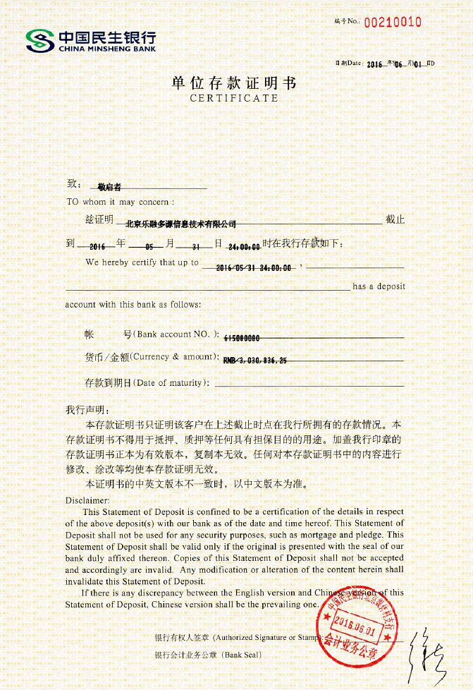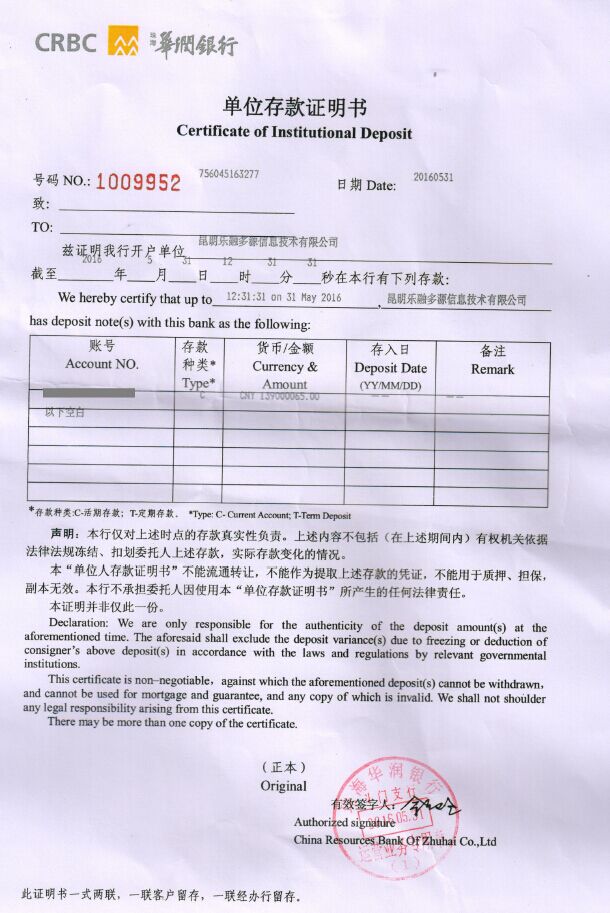 华润银行穹顶计划储备资金存款证明(扫描件):