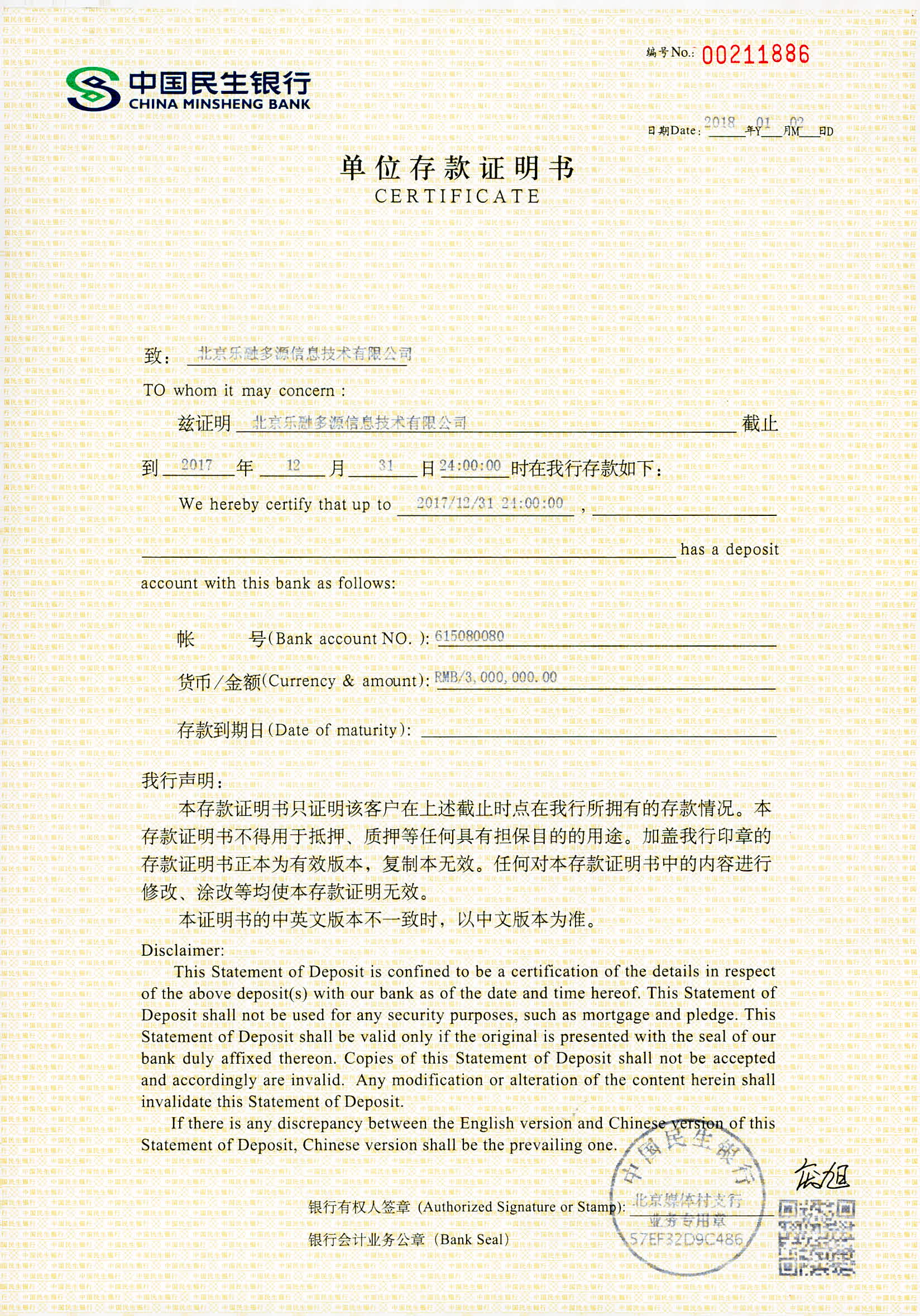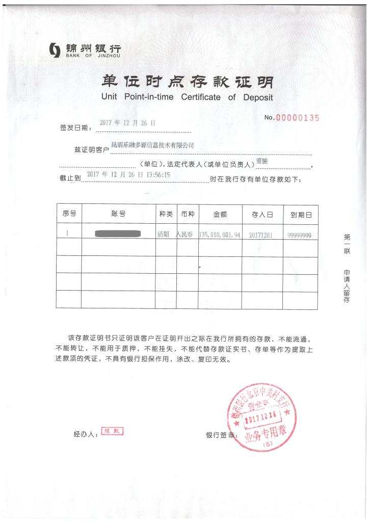 锦州银行穹顶计划储备资金存款证明(扫描件):