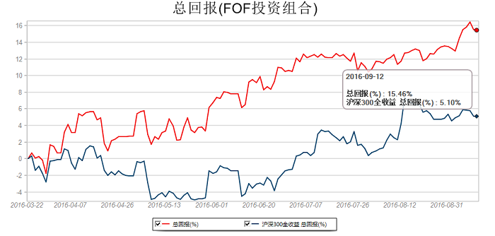 FOF 组合(红线)与沪深 300 全收益总回报对比如下:
