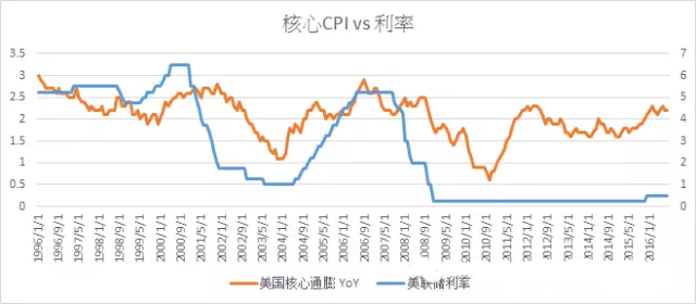 核心通货膨胀(不含食品、能源)是美国考虑是否升息的因素。历史数据显示, 核心通货膨胀上升有利于美国升息。从2015年开始核心通货膨胀重回 2%。未来若商品指数走强, 美国升息几率将加大;但商品价格持续变高,也意味着全球其他市场将进入升息通道。而现在,短期内全球市场商品需求依然较弱, 出现连续性升息机率较低。