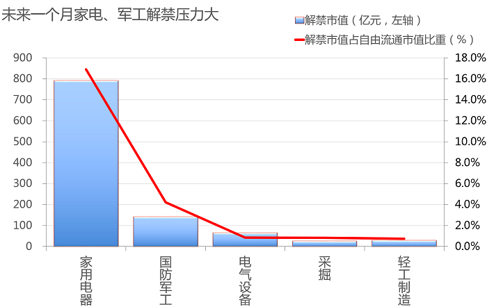 根据wind统计,接下来解禁量较大的周为9月最末周和11月第一周,投资者应尤为注意。据统计,未来一个月(9月14日-10月14日)解禁总市值为 1444 亿元,较上周小幅减少 1.0%;分行业来看,解禁市值由高到低排名分别为家用电器、国防军工和电气设备,若看解禁市值占 A 股流通市值比重,则家用电器和军工受解禁的冲击会更高一些,其中家用电器解禁市值占流通市值比例高达16.9%,主要集中在美的集团这只个股,该股将于2016年9月19日解禁 778 亿元(按最新股价测算),占公司流通 A 股的 88%,考虑到该股已累计较大涨幅,解禁恐引发集中抛售,建议投资者关注。