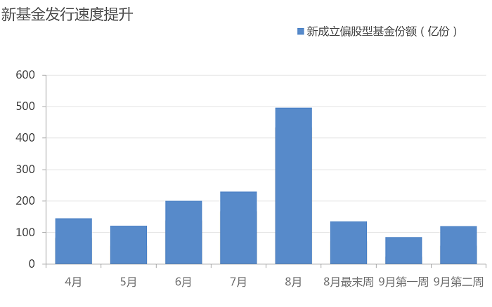 8月偏股型基金新成立份额为 496.5 亿份,大幅高于7月的发行量,新基发行速度大幅提升,其中半成以上为灵活配置型基金,反映出基金经理在股灾后倾向于发行仓位灵活的基金产品,方便风险管理。9月第二周新成立基金 120.0 亿份,高于第一周,其中募集份额较多的新基金有华安智增精选,为灵活配置型基金,专注掘金定增市场,截止日份额高达 13 亿份。截至9月13日偏股型基金数量攀升至 1921 只,份额环比增加 33 亿份,增幅达 0.2%,资产净值环比增加 45 亿元,增幅达 0.20%,基金资产规模持续增长。仓位方面,截至9月9日(上周五),全部基金仓位达 54.88%,较前周增加 0.36 个百分点,其中股票型及混合型基金仓位分别加仓 0.8% 和 2.6%,高于同期 A 股市值增加幅度,加仓反映基金经理对 A 股态度转暖。