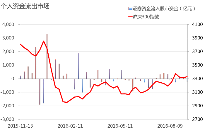 截至9月9日(上周五),证券市场交易结算资金余额日平均数为 15041 亿元(即账户存量资金),周环比增加 1.8%。在9月2日到9月9日期间,银证转帐净额减少 230 亿元(从银行账户转入证券账户的资金),但结算资金期末余额仅减少 31 亿元,这意味着9月9日这周有 199 亿元的资金流出股市,上周五黑天鹅事件影响散户心态,多数人选择落袋为安,加上假期临近资金需求较大,短期可能延续净流出局面,利空股市表现。