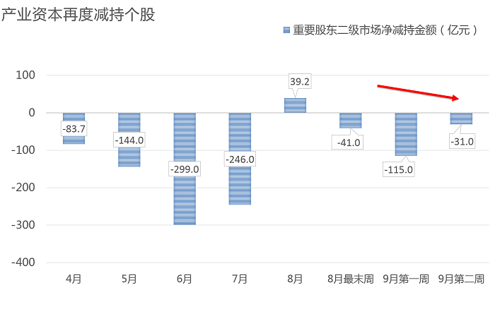 3月“禁减令”解除后,大股东对限售股的减持缓缓拉开大幕。8月在恒大增持万科A及中报披露等因素的影响下,转为净增持,金额为 39.2 亿元。进入9月后,产业资本重新转为净减持,第二周增持额为 7.4 亿元,减持额为 38.4 亿元,净减持额达31亿元。从行业来看,增持较多的行业有公用事业、房地产、电气设备和非银金融,减持多发生在机械设备、电子、计算机和建筑装饰等行业。