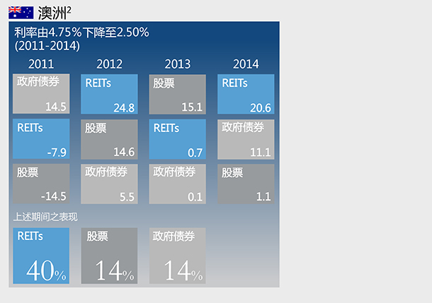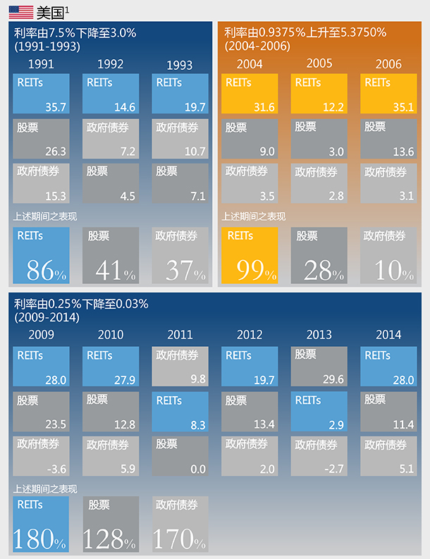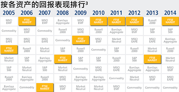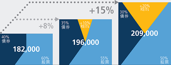 下图显示于1984年12月31日分别投资10,000美元于三种不同投资组合后,到了2014年12月31日的所得。包含20%REITs资产的投资组合,表现超越传统股票/债券组合多达15%2。